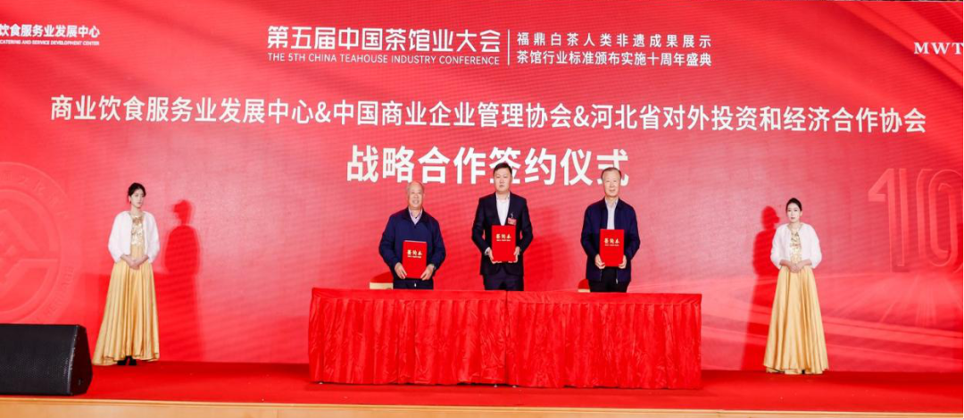 张艳彬主任、刘育才会长、奚献军会长分别代表商业饮食服务业发展中心、中国商业管理协会、河北省对外投资和经济合作协会举行了战略合作签约仪式。三方签约为中国茶馆业大会品牌走出国门,打造茶文化出海,助力企业走出去又增添了中国力量。
