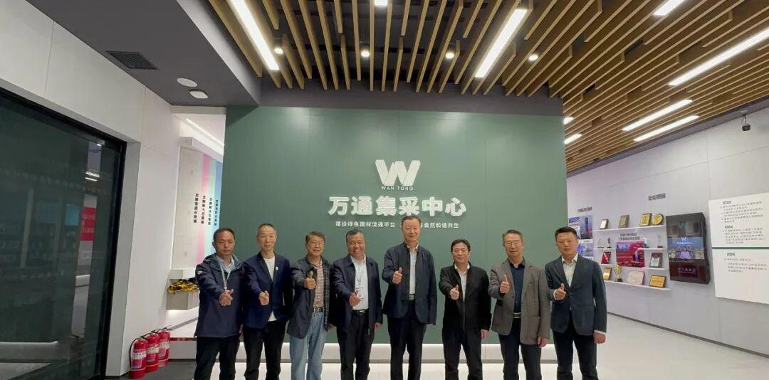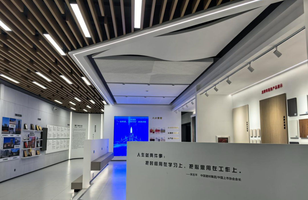 在安总的引导下,奚献军会长一行首先参观了企业2024年底刚刚落成的公司集采中心展示厅,这是万通企业精心打造的第三代商业展厅。在公司党建工作展区,安总给大家介绍到,公司非常重视党组织建设,截至目前,企业也是同行业唯一一个成立党支部的公司。随着大家沿着大厅不断前行,一个极具现代化、科技感、绿色环保、文化色彩集一身的标准展厅逐渐呈现在大家眼前,给人一种视觉的享受。安彦超董事长介绍到,该展厅是以“数字化+AI技术”为核心,颠覆传统建材展陈模式,将水、电、木、瓦、油等基础装修材料的全流程透明化展示,并融合绿色环保理念,汇聚国内外百余家知名品牌,打造了一站式选材体验平台。展厅通过地暖布管、木材溯源、建筑装饰石膏、涂料、水泥衍生产品、轻钢龙骨、电线电缆及配套用品、还有一些小型具有同时吸附尘屑的现代化施工工具等细节展示,向消费者传递产品核心价值,同时依托“全国配送+集中采购+24小时服务”的布局,推动行业智能化升级。大家感觉到展馆的设计和建造凝聚着万通人的汗水和智慧,在参观的过程中不时的发出赞誉之声,奚献军会长对万通在场景创新和数字化转型中的实践表示高度认可和称赞。