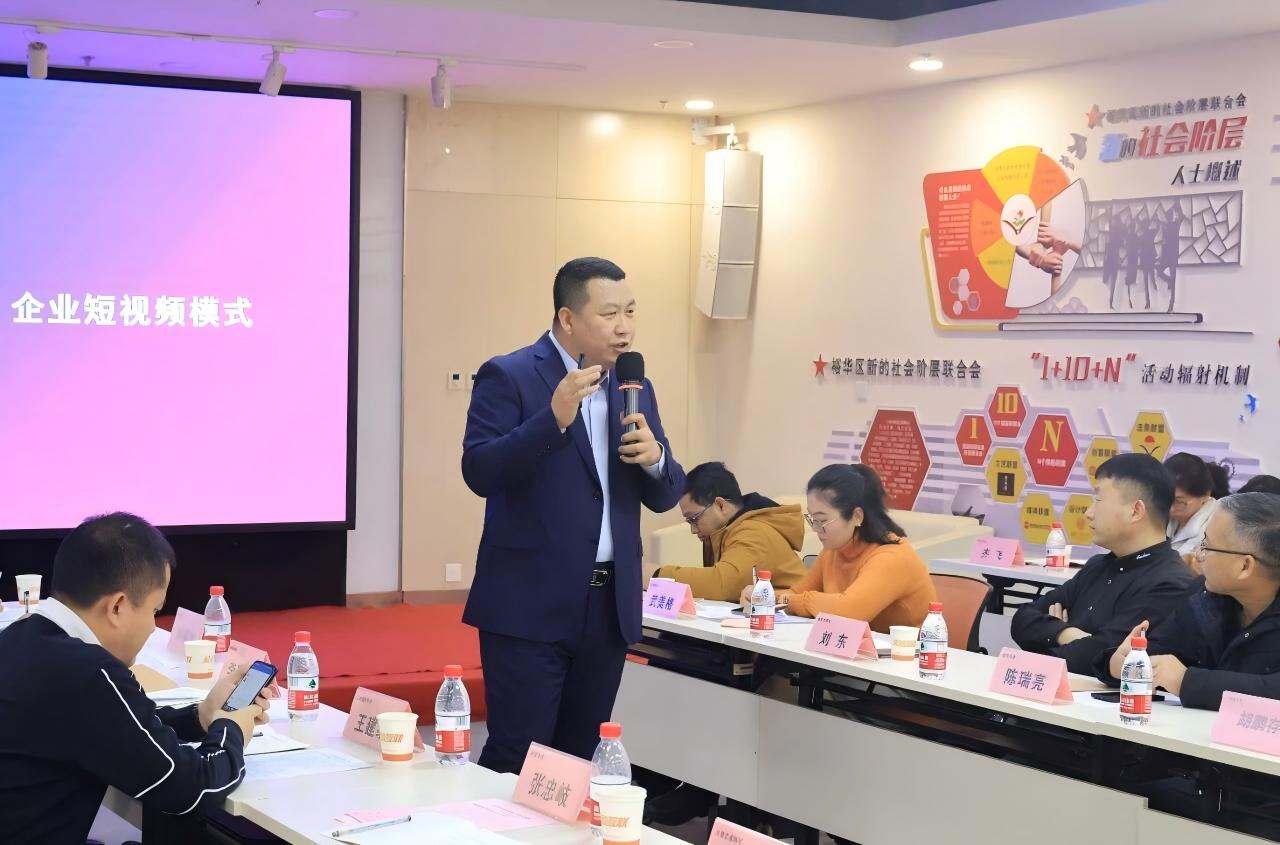 第三个给企业家辅导授课的,是此次沙龙的承办方石家庄天助志成科技有限公司、牛商股份河北运营中心的田克军总经理。他为企业家分享了关于企业短视频营销中遇到的问题、账号搭建、AI文案剪辑、矩阵营销的解决方案。针对“大部分企业都充分认识到当下视频营销的重要性,但是大家都把握不好视频的制作和推广,在视频营销的过程中经济转换率不高,未能达到预期的效果”的问题,他强调,企业要做好短视频就要从“定位、内容、运营、推广、转化”五部分,建立企业的全域短视频盈利系统,从点到面,做好布局。