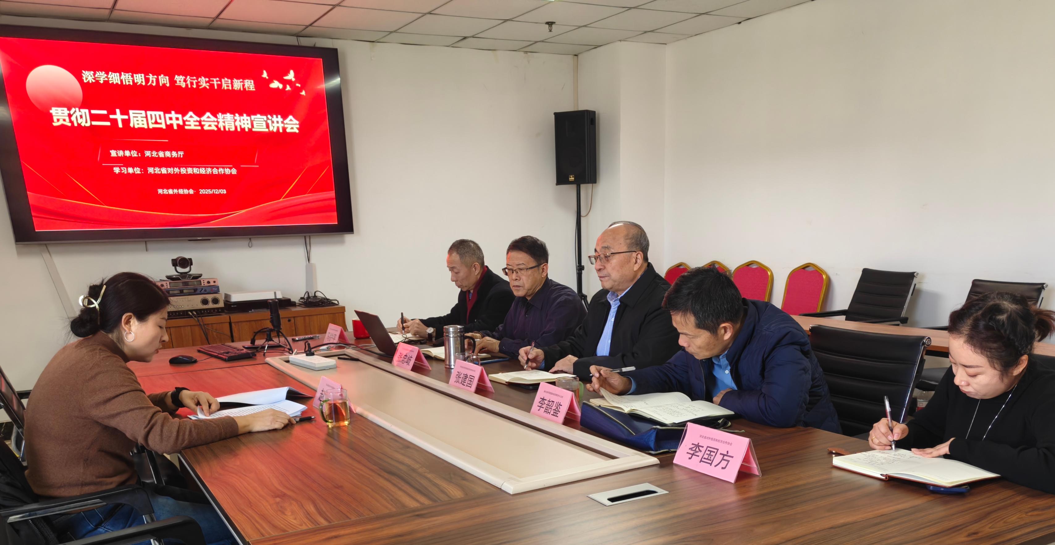 12月3日,为深入学习贯彻党的二十届四中全会精神和关于“加强新经济组织、新社会组织、新就业群体党的建设”的重要部署,河北省商务厅党组织到河北省对外投资和经济合作协会组织召开宣传贯彻二十届四中全会精神专题宣讲会,向协会党组织传达四中全会精神、部署新时代协会党建工作重点任务,以高质量党建引领对外经济合作事业高质量发展。河北省外经协会党支部张建国,组织委员、协会驻会副会长张忠岐,宣传委员王芳;协会智库专家、省社会科学院城市经济研究中心主任李韶鉴,协会副秘书长马护平,会员企业代表李国方等参加了宣讲会议。